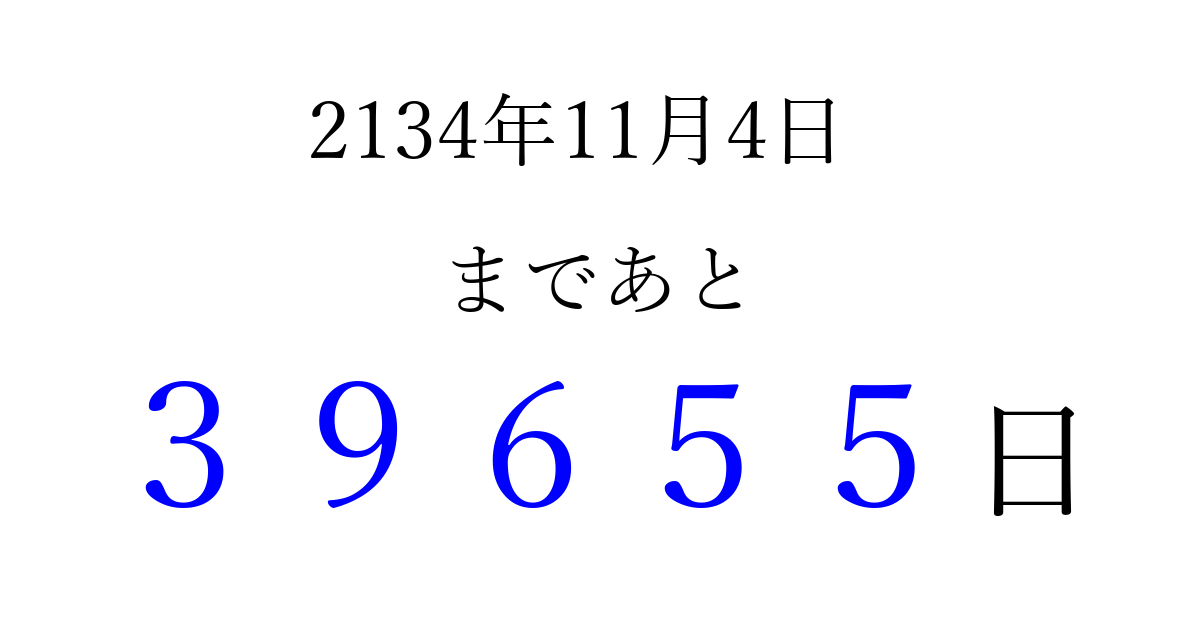 2134年11月4日(木)まで あと 99999 日です 追加すると、トップページからすぐ選べるようになります ※2026/04/09現在の結果です。 最新の状態に更新する ↓シェアして、タイムライン上にカウントダウンを表示しよう!↓ 📤 この結果を共有する Tweet シェア Threads Bluesky 別の日付でカウントダウン 2134年11月のカレンダー このページをブックマークに追加すると、いつでもカウントダウンを確認できます。 (PC: Ctrl+D / Mac: ⌘+D) hitome-notes.comでは以下のページも運営しています。 指定日と期間から日付を計算 | ガチャ確率計算・シミュレーション | プライバシー・ポリシー 運営者:Avocado