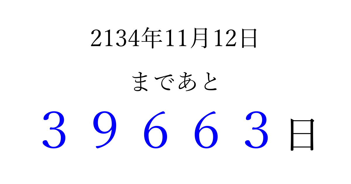 2134年11月12日(金)まで あと 99999 日です 追加すると、トップページからすぐ選べるようになります ※2026/04/09現在の結果です。 最新の状態に更新する ↓シェアして、タイムライン上にカウントダウンを表示しよう!↓ 📤 この結果を共有する Tweet シェア Threads Bluesky 別の日付でカウントダウン 2134年11月のカレンダー このページをブックマークに追加すると、いつでもカウントダウンを確認できます。 (PC: Ctrl+D / Mac: ⌘+D) hitome-notes.comでは以下のページも運営しています。 指定日と期間から日付を計算 | ガチャ確率計算・シミュレーション | プライバシー・ポリシー 運営者:Avocado