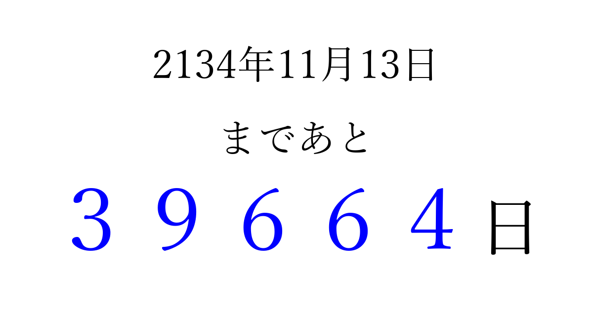 2134年11月13日(土)まで あと 99999 日です 追加すると、トップページからすぐ選べるようになります ※2026/04/09現在の結果です。 最新の状態に更新する ↓シェアして、タイムライン上にカウントダウンを表示しよう!↓ 📤 この結果を共有する Tweet シェア Threads Bluesky 別の日付でカウントダウン 2134年11月のカレンダー このページをブックマークに追加すると、いつでもカウントダウンを確認できます。 (PC: Ctrl+D / Mac: ⌘+D) hitome-notes.comでは以下のページも運営しています。 指定日と期間から日付を計算 | ガチャ確率計算・シミュレーション | プライバシー・ポリシー 運営者:Avocado