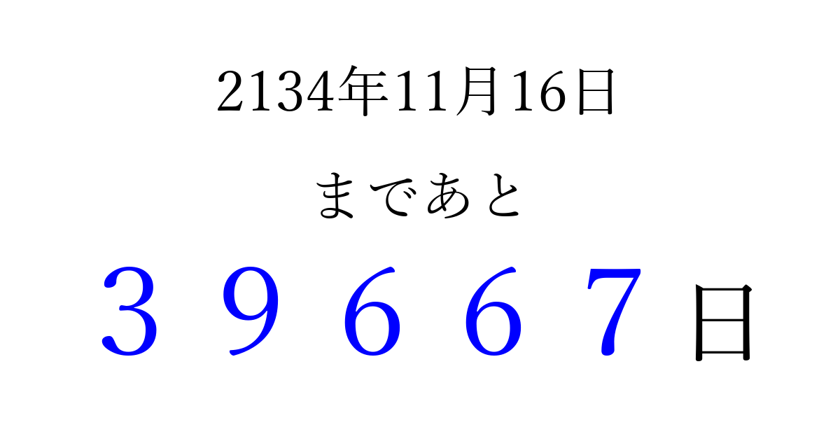 2134年11月16日(火)まで あと 99999 日です 追加すると、トップページからすぐ選べるようになります ※2026/04/09現在の結果です。 最新の状態に更新する ↓シェアして、タイムライン上にカウントダウンを表示しよう!↓ 📤 この結果を共有する Tweet シェア Threads Bluesky 別の日付でカウントダウン 2134年11月のカレンダー このページをブックマークに追加すると、いつでもカウントダウンを確認できます。 (PC: Ctrl+D / Mac: ⌘+D) hitome-notes.comでは以下のページも運営しています。 指定日と期間から日付を計算 | ガチャ確率計算・シミュレーション | プライバシー・ポリシー 運営者:Avocado
