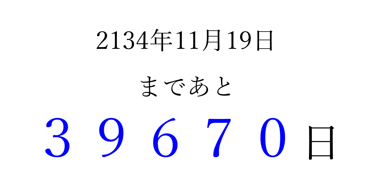 2134年11月19日(金)まで あと 99999 日です 追加すると、トップページからすぐ選べるようになります ※2026/04/09現在の結果です。 最新の状態に更新する ↓シェアして、タイムライン上にカウントダウンを表示しよう!↓ 📤 この結果を共有する Tweet シェア Threads Bluesky 別の日付でカウントダウン 2134年11月のカレンダー このページをブックマークに追加すると、いつでもカウントダウンを確認できます。 (PC: Ctrl+D / Mac: ⌘+D) hitome-notes.comでは以下のページも運営しています。 指定日と期間から日付を計算 | ガチャ確率計算・シミュレーション | プライバシー・ポリシー 運営者:Avocado