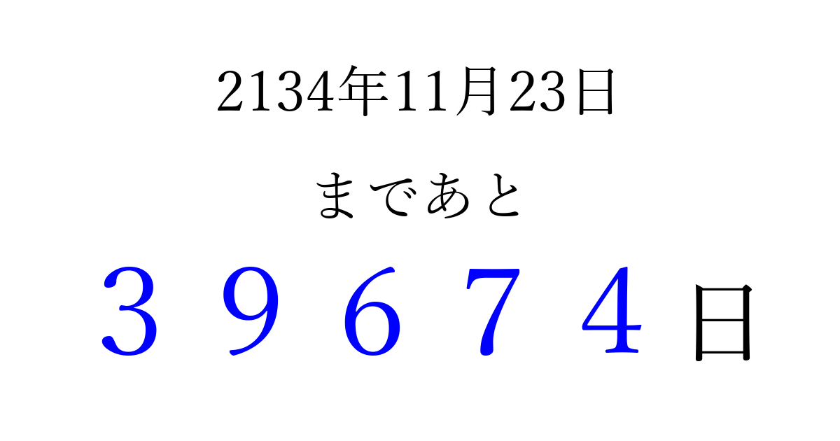 2134年11月23日(火)まで あと 99999 日です 追加すると、トップページからすぐ選べるようになります ※2026/04/09現在の結果です。 最新の状態に更新する ↓シェアして、タイムライン上にカウントダウンを表示しよう!↓ 📤 この結果を共有する Tweet シェア Threads Bluesky 別の日付でカウントダウン 2134年11月のカレンダー このページをブックマークに追加すると、いつでもカウントダウンを確認できます。 (PC: Ctrl+D / Mac: ⌘+D) hitome-notes.comでは以下のページも運営しています。 指定日と期間から日付を計算 | ガチャ確率計算・シミュレーション | プライバシー・ポリシー 運営者:Avocado