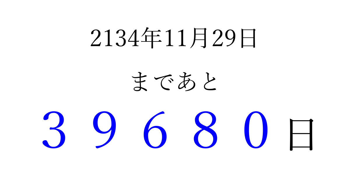 2134年11月29日(月)まで あと 99999 日です 追加すると、トップページからすぐ選べるようになります ※2026/04/09現在の結果です。 最新の状態に更新する ↓シェアして、タイムライン上にカウントダウンを表示しよう!↓ 📤 この結果を共有する Tweet シェア Threads Bluesky 別の日付でカウントダウン 2134年11月のカレンダー このページをブックマークに追加すると、いつでもカウントダウンを確認できます。 (PC: Ctrl+D / Mac: ⌘+D) hitome-notes.comでは以下のページも運営しています。 指定日と期間から日付を計算 | ガチャ確率計算・シミュレーション | プライバシー・ポリシー 運営者:Avocado