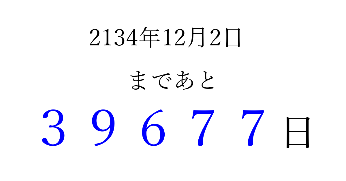 2134年12月2日(木)まで あと 99999 日です 追加すると、トップページからすぐ選べるようになります ※2026/04/15現在の結果です。 最新の状態に更新する ↓シェアして、タイムライン上にカウントダウンを表示しよう!↓ 📤 この結果を共有する Tweet シェア Threads Bluesky 別の日付でカウントダウン 2134年12月のカレンダー このページをブックマークに追加すると、いつでもカウントダウンを確認できます。 (PC: Ctrl+D / Mac: ⌘+D) hitome-notes.comでは以下のページも運営しています。 指定日と期間から日付を計算 | ガチャ確率計算・シミュレーション | プライバシー・ポリシー 運営者:Avocado