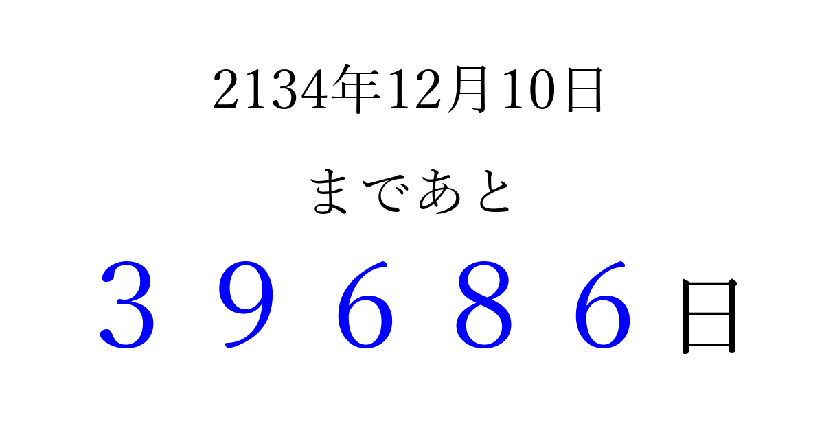 2134年12月10日(金)まで あと 99999 日です 追加すると、トップページからすぐ選べるようになります ※2026/04/14現在の結果です。 最新の状態に更新する ↓シェアして、タイムライン上にカウントダウンを表示しよう!↓ 📤 この結果を共有する Tweet シェア Threads Bluesky 別の日付でカウントダウン 2134年12月のカレンダー このページをブックマークに追加すると、いつでもカウントダウンを確認できます。 (PC: Ctrl+D / Mac: ⌘+D) hitome-notes.comでは以下のページも運営しています。 指定日と期間から日付を計算 | ガチャ確率計算・シミュレーション | プライバシー・ポリシー 運営者:Avocado