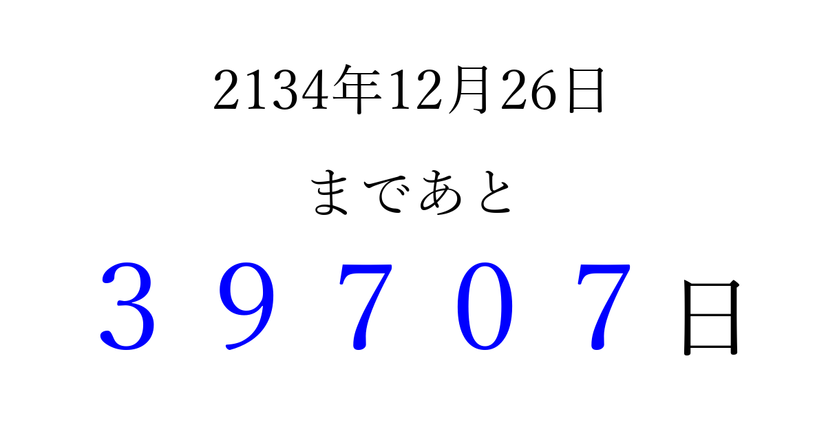 2134年12月26日(日)まで あと 99999 日です 追加すると、トップページからすぐ選べるようになります ※2026/04/09現在の結果です。 最新の状態に更新する ↓シェアして、タイムライン上にカウントダウンを表示しよう!↓ 📤 この結果を共有する Tweet シェア Threads Bluesky 別の日付でカウントダウン 2134年12月のカレンダー このページをブックマークに追加すると、いつでもカウントダウンを確認できます。 (PC: Ctrl+D / Mac: ⌘+D) hitome-notes.comでは以下のページも運営しています。 指定日と期間から日付を計算 | ガチャ確率計算・シミュレーション | プライバシー・ポリシー 運営者:Avocado