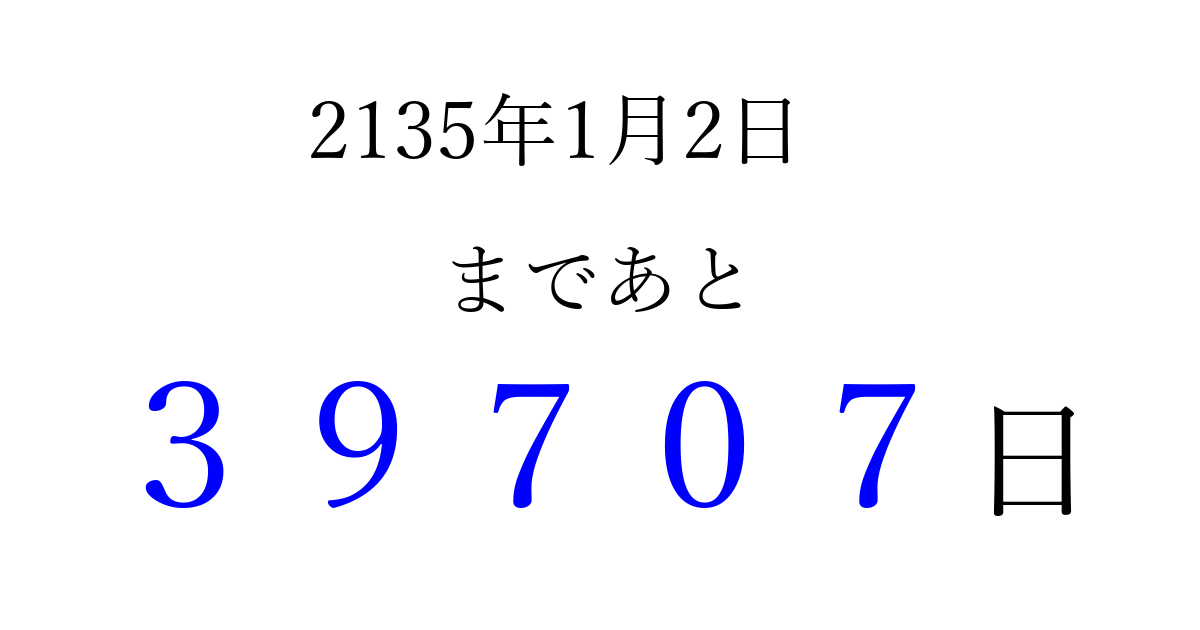 2135年1月2日(日)まで あと 99999 日です 追加すると、トップページからすぐ選べるようになります ※2026/04/16現在の結果です。 最新の状態に更新する ↓シェアして、タイムライン上にカウントダウンを表示しよう!↓ 📤 この結果を共有する Tweet シェア Threads Bluesky 別の日付でカウントダウン 2135年1月のカレンダー このページをブックマークに追加すると、いつでもカウントダウンを確認できます。 (PC: Ctrl+D / Mac: ⌘+D) hitome-notes.comでは以下のページも運営しています。 指定日と期間から日付を計算 | ガチャ確率計算・シミュレーション | プライバシー・ポリシー 運営者:Avocado