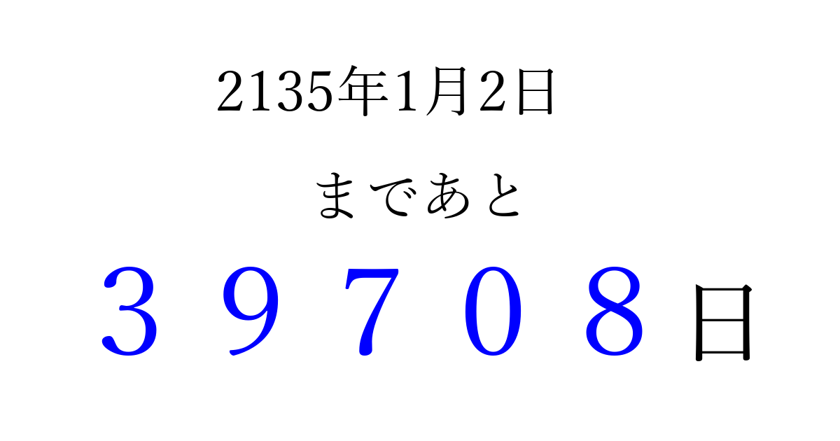 2135年1月2日(日)まで あと 99999 日です 追加すると、トップページからすぐ選べるようになります ※2026/04/15現在の結果です。 最新の状態に更新する ↓シェアして、タイムライン上にカウントダウンを表示しよう!↓ 📤 この結果を共有する Tweet シェア Threads Bluesky 別の日付でカウントダウン 2135年1月のカレンダー このページをブックマークに追加すると、いつでもカウントダウンを確認できます。 (PC: Ctrl+D / Mac: ⌘+D) hitome-notes.comでは以下のページも運営しています。 指定日と期間から日付を計算 | ガチャ確率計算・シミュレーション | プライバシー・ポリシー 運営者:Avocado