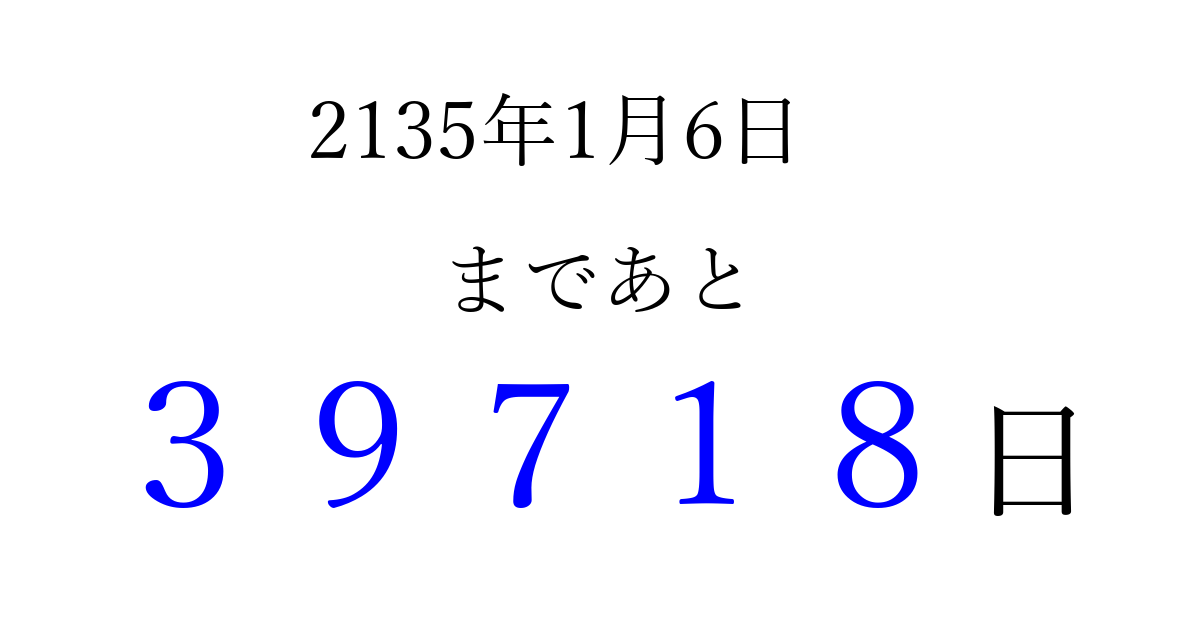 2135年1月6日(木)まで あと 99999 日です 追加すると、トップページからすぐ選べるようになります ※2026/04/09現在の結果です。 最新の状態に更新する ↓シェアして、タイムライン上にカウントダウンを表示しよう!↓ 📤 この結果を共有する Tweet シェア Threads Bluesky 別の日付でカウントダウン 2135年1月のカレンダー このページをブックマークに追加すると、いつでもカウントダウンを確認できます。 (PC: Ctrl+D / Mac: ⌘+D) hitome-notes.comでは以下のページも運営しています。 指定日と期間から日付を計算 | ガチャ確率計算・シミュレーション | プライバシー・ポリシー 運営者:Avocado