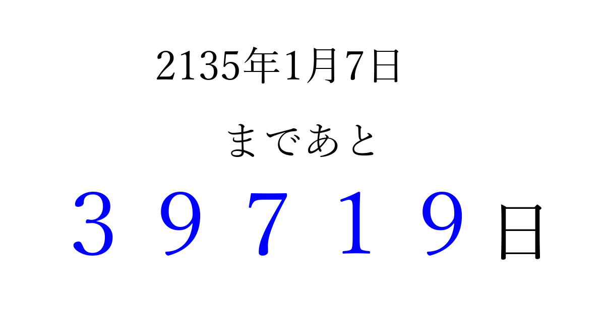2135年1月7日(金)まで あと 99999 日です 追加すると、トップページからすぐ選べるようになります ※2026/04/09現在の結果です。 最新の状態に更新する ↓シェアして、タイムライン上にカウントダウンを表示しよう!↓ 📤 この結果を共有する Tweet シェア Threads Bluesky 別の日付でカウントダウン 2135年1月のカレンダー このページをブックマークに追加すると、いつでもカウントダウンを確認できます。 (PC: Ctrl+D / Mac: ⌘+D) hitome-notes.comでは以下のページも運営しています。 指定日と期間から日付を計算 | ガチャ確率計算・シミュレーション | プライバシー・ポリシー 運営者:Avocado
