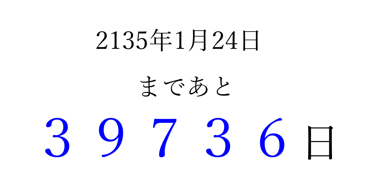2135年1月24日(月)まで あと 99999 日です 追加すると、トップページからすぐ選べるようになります ※2026/04/09現在の結果です。 最新の状態に更新する ↓シェアして、タイムライン上にカウントダウンを表示しよう!↓ 📤 この結果を共有する Tweet シェア Threads Bluesky 別の日付でカウントダウン 2135年1月のカレンダー このページをブックマークに追加すると、いつでもカウントダウンを確認できます。 (PC: Ctrl+D / Mac: ⌘+D) hitome-notes.comでは以下のページも運営しています。 指定日と期間から日付を計算 | ガチャ確率計算・シミュレーション | プライバシー・ポリシー 運営者:Avocado