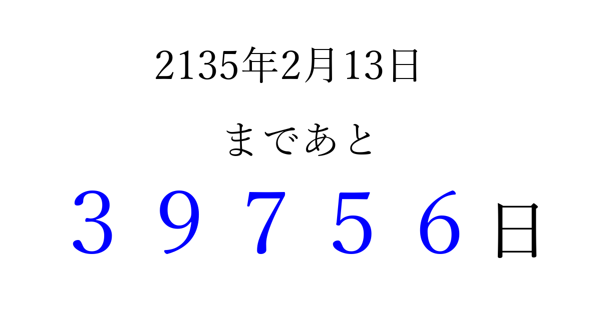 2135年2月13日(日)まで あと 99999 日です 追加すると、トップページからすぐ選べるようになります ※2026/04/09現在の結果です。 最新の状態に更新する ↓シェアして、タイムライン上にカウントダウンを表示しよう!↓ 📤 この結果を共有する Tweet シェア Threads Bluesky 別の日付でカウントダウン 2135年2月のカレンダー このページをブックマークに追加すると、いつでもカウントダウンを確認できます。 (PC: Ctrl+D / Mac: ⌘+D) hitome-notes.comでは以下のページも運営しています。 指定日と期間から日付を計算 | ガチャ確率計算・シミュレーション | プライバシー・ポリシー 運営者:Avocado