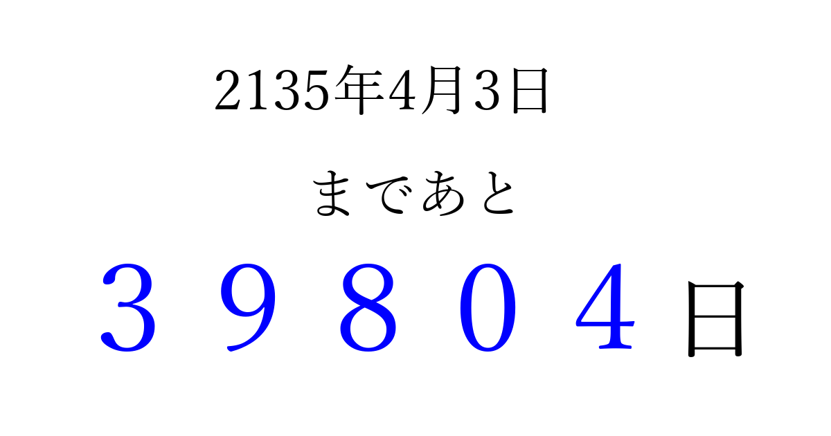 2135年4月3日(日)まで あと 99999 日です 追加すると、トップページからすぐ選べるようになります ※2026/04/10現在の結果です。 最新の状態に更新する ↓シェアして、タイムライン上にカウントダウンを表示しよう!↓ 📤 この結果を共有する Tweet シェア Threads Bluesky 別の日付でカウントダウン 2135年4月のカレンダー このページをブックマークに追加すると、いつでもカウントダウンを確認できます。 (PC: Ctrl+D / Mac: ⌘+D) hitome-notes.comでは以下のページも運営しています。 指定日と期間から日付を計算 | ガチャ確率計算・シミュレーション | プライバシー・ポリシー 運営者:Avocado