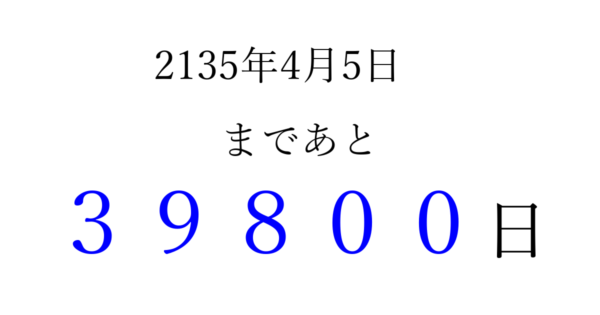 2135年4月5日(火)まで あと 99999 日です 追加すると、トップページからすぐ選べるようになります ※2026/04/16現在の結果です。 最新の状態に更新する ↓シェアして、タイムライン上にカウントダウンを表示しよう!↓ 📤 この結果を共有する Tweet シェア Threads Bluesky 別の日付でカウントダウン 2135年4月のカレンダー このページをブックマークに追加すると、いつでもカウントダウンを確認できます。 (PC: Ctrl+D / Mac: ⌘+D) hitome-notes.comでは以下のページも運営しています。 指定日と期間から日付を計算 | ガチャ確率計算・シミュレーション | プライバシー・ポリシー 運営者:Avocado