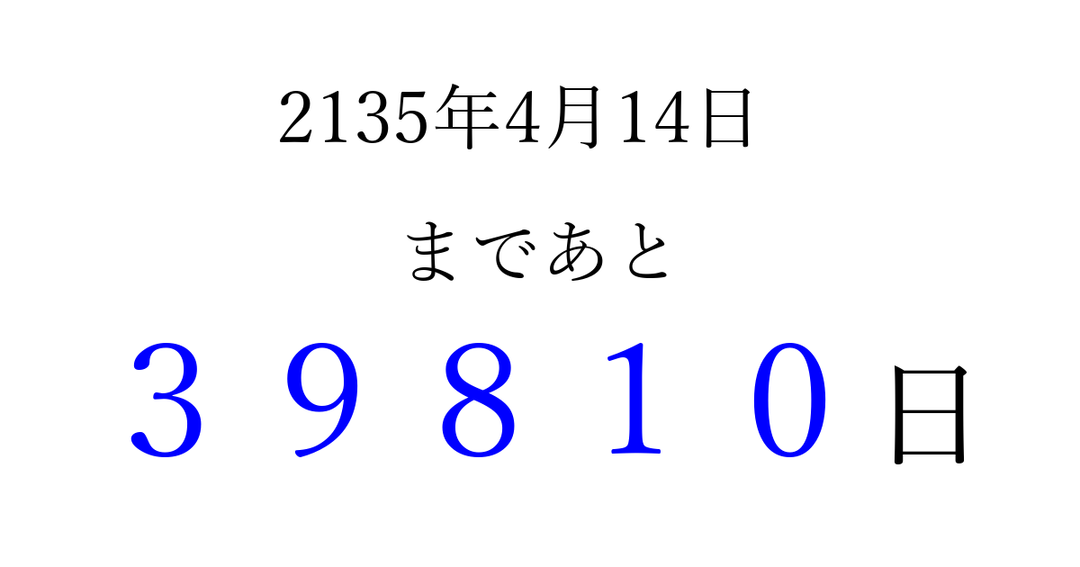 2135年4月14日(木)まで あと 99999 日です 追加すると、トップページからすぐ選べるようになります ※2026/04/15現在の結果です。 最新の状態に更新する ↓シェアして、タイムライン上にカウントダウンを表示しよう!↓ 📤 この結果を共有する Tweet シェア Threads Bluesky 別の日付でカウントダウン 2135年4月のカレンダー このページをブックマークに追加すると、いつでもカウントダウンを確認できます。 (PC: Ctrl+D / Mac: ⌘+D) hitome-notes.comでは以下のページも運営しています。 指定日と期間から日付を計算 | ガチャ確率計算・シミュレーション | プライバシー・ポリシー 運営者:Avocado