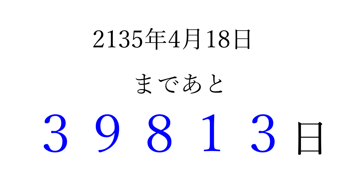 2135年4月18日(月)まで あと 99999 日です 追加すると、トップページからすぐ選べるようになります ※2026/04/16現在の結果です。 最新の状態に更新する ↓シェアして、タイムライン上にカウントダウンを表示しよう!↓ 📤 この結果を共有する Tweet シェア Threads Bluesky 別の日付でカウントダウン 2135年4月のカレンダー このページをブックマークに追加すると、いつでもカウントダウンを確認できます。 (PC: Ctrl+D / Mac: ⌘+D) hitome-notes.comでは以下のページも運営しています。 指定日と期間から日付を計算 | ガチャ確率計算・シミュレーション | プライバシー・ポリシー 運営者:Avocado