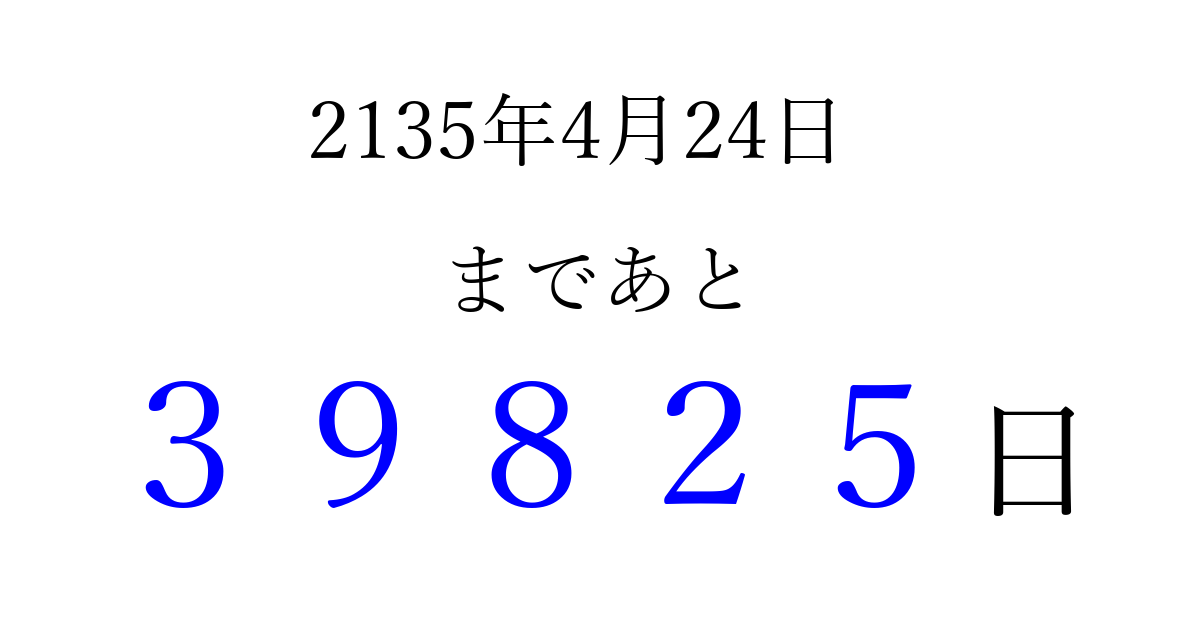 2135年4月24日(日)まで あと 99999 日です 追加すると、トップページからすぐ選べるようになります ※2026/04/10現在の結果です。 最新の状態に更新する ↓シェアして、タイムライン上にカウントダウンを表示しよう!↓ 📤 この結果を共有する Tweet シェア Threads Bluesky 別の日付でカウントダウン 2135年4月のカレンダー このページをブックマークに追加すると、いつでもカウントダウンを確認できます。 (PC: Ctrl+D / Mac: ⌘+D) hitome-notes.comでは以下のページも運営しています。 指定日と期間から日付を計算 | ガチャ確率計算・シミュレーション | プライバシー・ポリシー 運営者:Avocado
