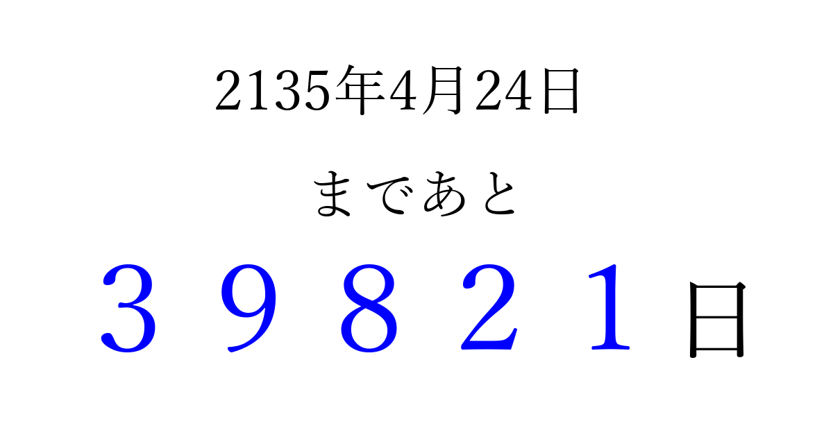2135年4月24日(日)まで あと 99999 日です 追加すると、トップページからすぐ選べるようになります ※2026/04/14現在の結果です。 最新の状態に更新する ↓シェアして、タイムライン上にカウントダウンを表示しよう!↓ 📤 この結果を共有する Tweet シェア Threads Bluesky 別の日付でカウントダウン 2135年4月のカレンダー このページをブックマークに追加すると、いつでもカウントダウンを確認できます。 (PC: Ctrl+D / Mac: ⌘+D) hitome-notes.comでは以下のページも運営しています。 指定日と期間から日付を計算 | ガチャ確率計算・シミュレーション | プライバシー・ポリシー 運営者:Avocado