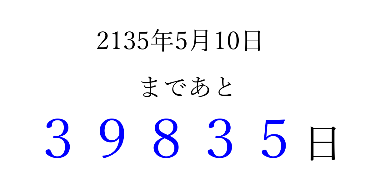 2135年5月10日(火)まで あと 99999 日です 追加すると、トップページからすぐ選べるようになります ※2026/04/16現在の結果です。 最新の状態に更新する ↓シェアして、タイムライン上にカウントダウンを表示しよう!↓ 📤 この結果を共有する Tweet シェア Threads Bluesky 別の日付でカウントダウン 2135年5月のカレンダー このページをブックマークに追加すると、いつでもカウントダウンを確認できます。 (PC: Ctrl+D / Mac: ⌘+D) hitome-notes.comでは以下のページも運営しています。 指定日と期間から日付を計算 | ガチャ確率計算・シミュレーション | プライバシー・ポリシー 運営者:Avocado