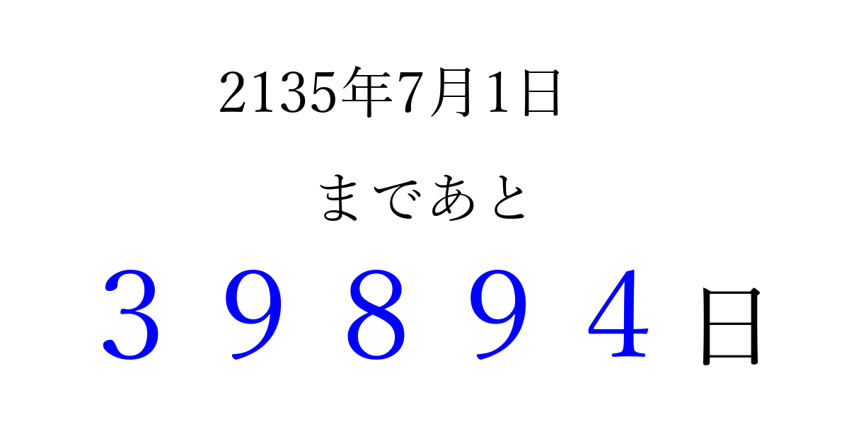 2135年7月1日(金)まで あと 99999 日です 追加すると、トップページからすぐ選べるようになります ※2026/04/09現在の結果です。 最新の状態に更新する ↓シェアして、タイムライン上にカウントダウンを表示しよう!↓ 📤 この結果を共有する Tweet シェア Threads Bluesky 別の日付でカウントダウン 2135年7月のカレンダー このページをブックマークに追加すると、いつでもカウントダウンを確認できます。 (PC: Ctrl+D / Mac: ⌘+D) hitome-notes.comでは以下のページも運営しています。 指定日と期間から日付を計算 | ガチャ確率計算・シミュレーション | プライバシー・ポリシー 運営者:Avocado