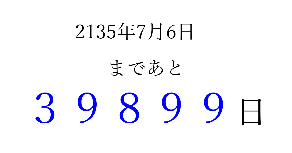 2135年7月6日(水)まで あと 99999 日です 追加すると、トップページからすぐ選べるようになります ※2026/04/09現在の結果です。 最新の状態に更新する ↓シェアして、タイムライン上にカウントダウンを表示しよう!↓ 📤 この結果を共有する Tweet シェア Threads Bluesky 別の日付でカウントダウン 2135年7月のカレンダー このページをブックマークに追加すると、いつでもカウントダウンを確認できます。 (PC: Ctrl+D / Mac: ⌘+D) hitome-notes.comでは以下のページも運営しています。 指定日と期間から日付を計算 | ガチャ確率計算・シミュレーション | プライバシー・ポリシー 運営者:Avocado