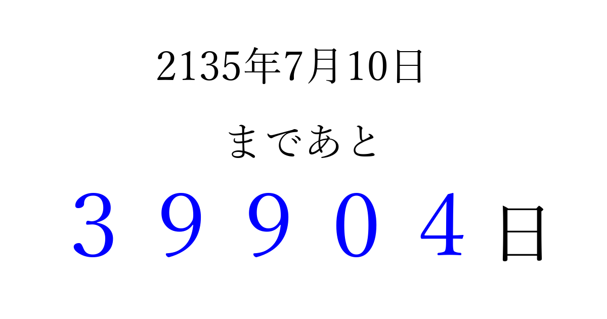 2135年7月10日(日)まで あと 99999 日です 追加すると、トップページからすぐ選べるようになります ※2026/04/08現在の結果です。 最新の状態に更新する ↓シェアして、タイムライン上にカウントダウンを表示しよう!↓ 📤 この結果を共有する Tweet シェア Threads Bluesky 別の日付でカウントダウン 2135年7月のカレンダー このページをブックマークに追加すると、いつでもカウントダウンを確認できます。 (PC: Ctrl+D / Mac: ⌘+D) hitome-notes.comでは以下のページも運営しています。 指定日と期間から日付を計算 | ガチャ確率計算・シミュレーション | プライバシー・ポリシー 運営者:Avocado