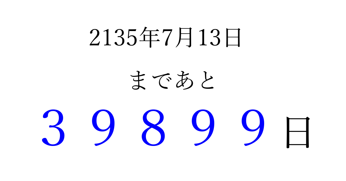 2135年7月13日(水)まで あと 99999 日です 追加すると、トップページからすぐ選べるようになります ※2026/04/16現在の結果です。 最新の状態に更新する ↓シェアして、タイムライン上にカウントダウンを表示しよう!↓ 📤 この結果を共有する Tweet シェア Threads Bluesky 別の日付でカウントダウン 2135年7月のカレンダー このページをブックマークに追加すると、いつでもカウントダウンを確認できます。 (PC: Ctrl+D / Mac: ⌘+D) hitome-notes.comでは以下のページも運営しています。 指定日と期間から日付を計算 | ガチャ確率計算・シミュレーション | プライバシー・ポリシー 運営者:Avocado