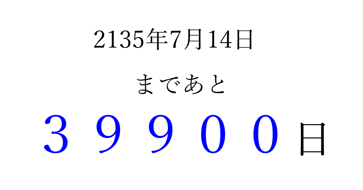 2135年7月14日(木)まで あと 99999 日です 追加すると、トップページからすぐ選べるようになります ※2026/04/16現在の結果です。 最新の状態に更新する ↓シェアして、タイムライン上にカウントダウンを表示しよう!↓ 📤 この結果を共有する Tweet シェア Threads Bluesky 別の日付でカウントダウン 2135年7月のカレンダー このページをブックマークに追加すると、いつでもカウントダウンを確認できます。 (PC: Ctrl+D / Mac: ⌘+D) hitome-notes.comでは以下のページも運営しています。 指定日と期間から日付を計算 | ガチャ確率計算・シミュレーション | プライバシー・ポリシー 運営者:Avocado