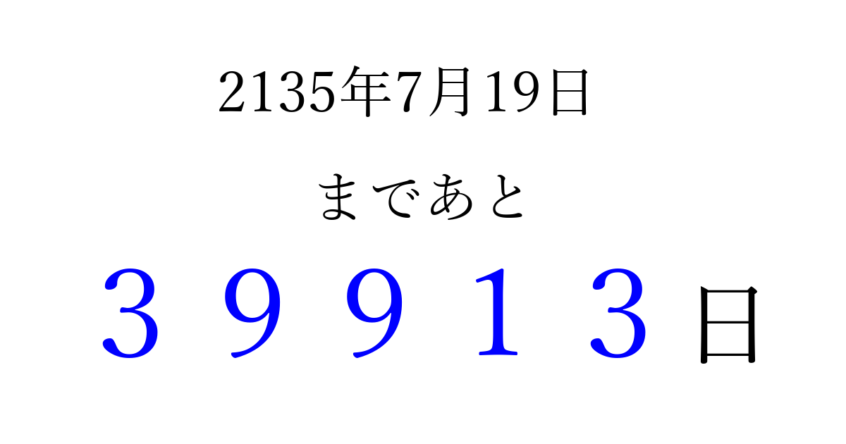 2135年7月19日(火)まで あと 99999 日です 追加すると、トップページからすぐ選べるようになります ※2026/04/08現在の結果です。 最新の状態に更新する ↓シェアして、タイムライン上にカウントダウンを表示しよう!↓ 📤 この結果を共有する Tweet シェア Threads Bluesky 別の日付でカウントダウン 2135年7月のカレンダー このページをブックマークに追加すると、いつでもカウントダウンを確認できます。 (PC: Ctrl+D / Mac: ⌘+D) hitome-notes.comでは以下のページも運営しています。 指定日と期間から日付を計算 | ガチャ確率計算・シミュレーション | プライバシー・ポリシー 運営者:Avocado