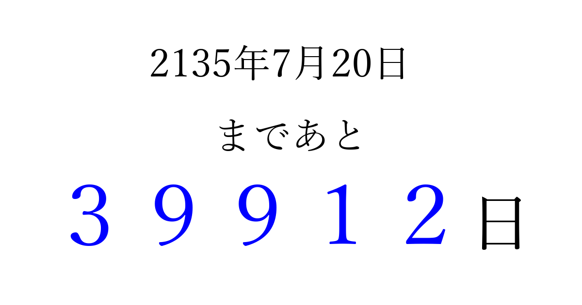 2135年7月20日(水)まで あと 99999 日です 追加すると、トップページからすぐ選べるようになります ※2026/04/10現在の結果です。 最新の状態に更新する ↓シェアして、タイムライン上にカウントダウンを表示しよう!↓ 📤 この結果を共有する Tweet シェア Threads Bluesky 別の日付でカウントダウン 2135年7月のカレンダー このページをブックマークに追加すると、いつでもカウントダウンを確認できます。 (PC: Ctrl+D / Mac: ⌘+D) hitome-notes.comでは以下のページも運営しています。 指定日と期間から日付を計算 | ガチャ確率計算・シミュレーション | プライバシー・ポリシー 運営者:Avocado