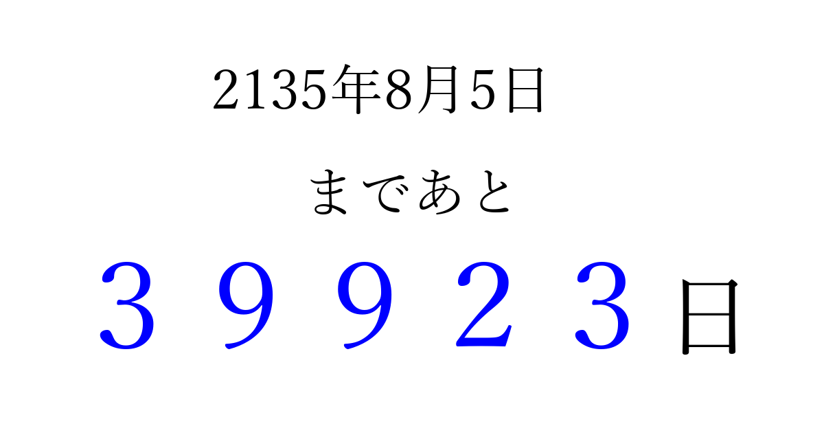 2135年8月5日(金)まで あと 99999 日です 追加すると、トップページからすぐ選べるようになります ※2026/04/15現在の結果です。 最新の状態に更新する ↓シェアして、タイムライン上にカウントダウンを表示しよう!↓ 📤 この結果を共有する Tweet シェア Threads Bluesky 別の日付でカウントダウン 2135年8月のカレンダー このページをブックマークに追加すると、いつでもカウントダウンを確認できます。 (PC: Ctrl+D / Mac: ⌘+D) hitome-notes.comでは以下のページも運営しています。 指定日と期間から日付を計算 | ガチャ確率計算・シミュレーション | プライバシー・ポリシー 運営者:Avocado