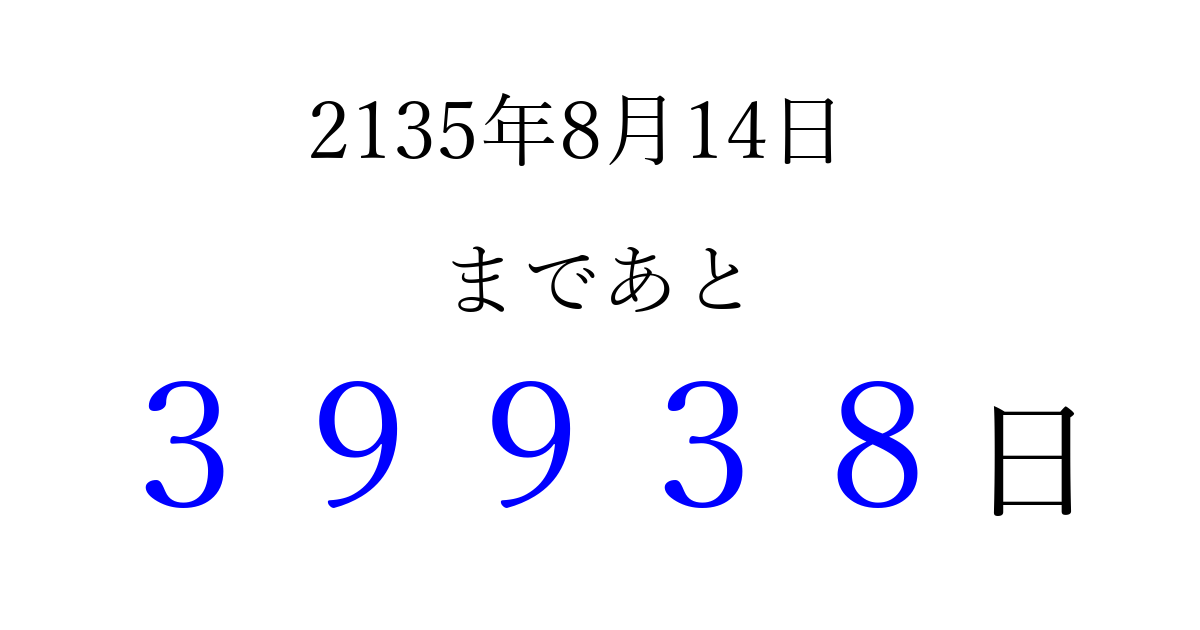 2135年8月14日(日)まで あと 99999 日です 追加すると、トップページからすぐ選べるようになります ※2026/04/09現在の結果です。 最新の状態に更新する ↓シェアして、タイムライン上にカウントダウンを表示しよう!↓ 📤 この結果を共有する Tweet シェア Threads Bluesky 別の日付でカウントダウン 2135年8月のカレンダー このページをブックマークに追加すると、いつでもカウントダウンを確認できます。 (PC: Ctrl+D / Mac: ⌘+D) hitome-notes.comでは以下のページも運営しています。 指定日と期間から日付を計算 | ガチャ確率計算・シミュレーション | プライバシー・ポリシー 運営者:Avocado
