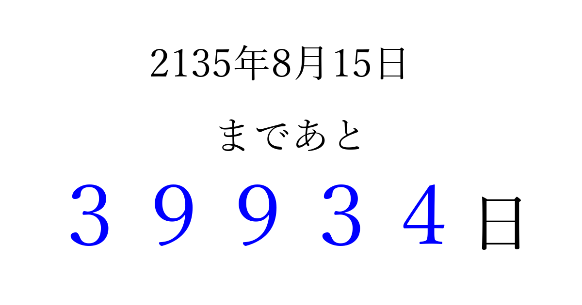 2135年8月15日(月)まで あと 99999 日です 追加すると、トップページからすぐ選べるようになります ※2026/04/14現在の結果です。 最新の状態に更新する ↓シェアして、タイムライン上にカウントダウンを表示しよう!↓ 📤 この結果を共有する Tweet シェア Threads Bluesky 別の日付でカウントダウン 2135年8月のカレンダー このページをブックマークに追加すると、いつでもカウントダウンを確認できます。 (PC: Ctrl+D / Mac: ⌘+D) hitome-notes.comでは以下のページも運営しています。 指定日と期間から日付を計算 | ガチャ確率計算・シミュレーション | プライバシー・ポリシー 運営者:Avocado