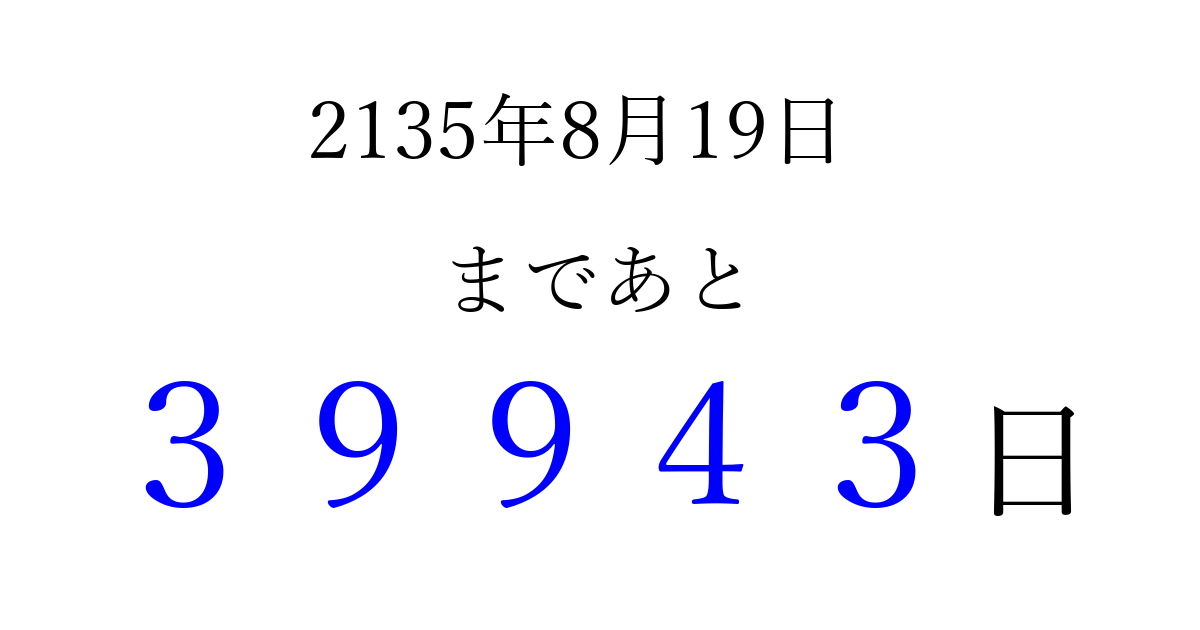 2135年8月19日(金)まで あと 99999 日です 追加すると、トップページからすぐ選べるようになります ※2026/04/09現在の結果です。 最新の状態に更新する ↓シェアして、タイムライン上にカウントダウンを表示しよう!↓ 📤 この結果を共有する Tweet シェア Threads Bluesky 別の日付でカウントダウン 2135年8月のカレンダー このページをブックマークに追加すると、いつでもカウントダウンを確認できます。 (PC: Ctrl+D / Mac: ⌘+D) hitome-notes.comでは以下のページも運営しています。 指定日と期間から日付を計算 | ガチャ確率計算・シミュレーション | プライバシー・ポリシー 運営者:Avocado