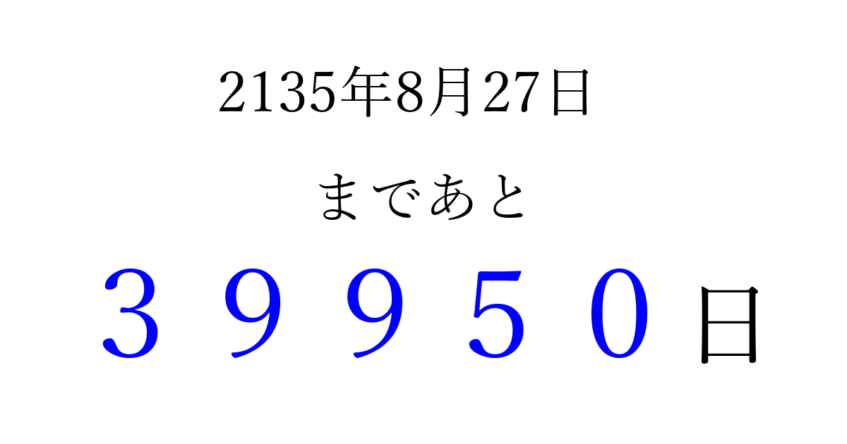 2135年8月27日(土)まで あと 99999 日です 追加すると、トップページからすぐ選べるようになります ※2026/04/10現在の結果です。 最新の状態に更新する ↓シェアして、タイムライン上にカウントダウンを表示しよう!↓ 📤 この結果を共有する Tweet シェア Threads Bluesky 別の日付でカウントダウン 2135年8月のカレンダー このページをブックマークに追加すると、いつでもカウントダウンを確認できます。 (PC: Ctrl+D / Mac: ⌘+D) hitome-notes.comでは以下のページも運営しています。 指定日と期間から日付を計算 | ガチャ確率計算・シミュレーション | プライバシー・ポリシー 運営者:Avocado