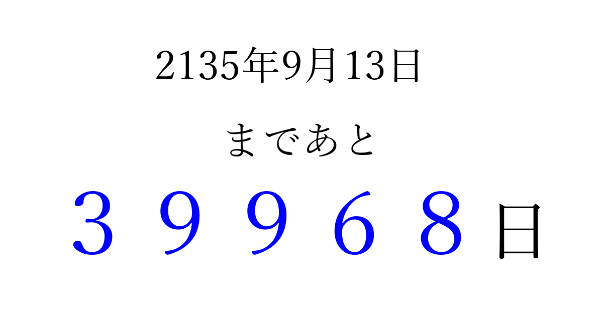 2135年9月13日(火)まで あと 99999 日です 追加すると、トップページからすぐ選べるようになります ※2026/04/09現在の結果です。 最新の状態に更新する ↓シェアして、タイムライン上にカウントダウンを表示しよう!↓ 📤 この結果を共有する Tweet シェア Threads Bluesky 別の日付でカウントダウン 2135年9月のカレンダー このページをブックマークに追加すると、いつでもカウントダウンを確認できます。 (PC: Ctrl+D / Mac: ⌘+D) hitome-notes.comでは以下のページも運営しています。 指定日と期間から日付を計算 | ガチャ確率計算・シミュレーション | プライバシー・ポリシー 運営者:Avocado
