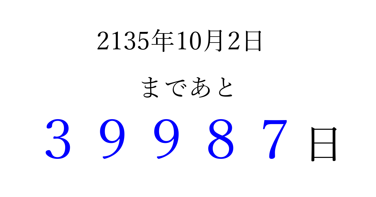 2135年10月2日(日)まで あと 99999 日です 追加すると、トップページからすぐ選べるようになります ※2026/04/09現在の結果です。 最新の状態に更新する ↓シェアして、タイムライン上にカウントダウンを表示しよう!↓ 📤 この結果を共有する Tweet シェア Threads Bluesky 別の日付でカウントダウン 2135年10月のカレンダー このページをブックマークに追加すると、いつでもカウントダウンを確認できます。 (PC: Ctrl+D / Mac: ⌘+D) hitome-notes.comでは以下のページも運営しています。 指定日と期間から日付を計算 | ガチャ確率計算・シミュレーション | プライバシー・ポリシー 運営者:Avocado