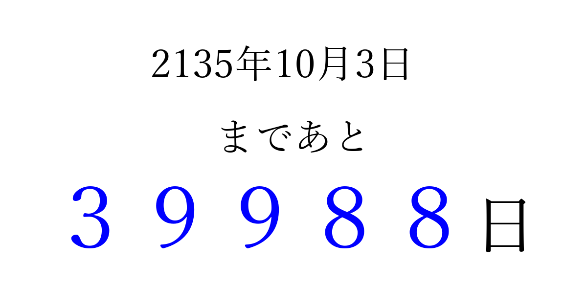 2135年10月3日(月)まで あと 99999 日です 追加すると、トップページからすぐ選べるようになります ※2026/04/09現在の結果です。 最新の状態に更新する ↓シェアして、タイムライン上にカウントダウンを表示しよう!↓ 📤 この結果を共有する Tweet シェア Threads Bluesky 別の日付でカウントダウン 2135年10月のカレンダー このページをブックマークに追加すると、いつでもカウントダウンを確認できます。 (PC: Ctrl+D / Mac: ⌘+D) hitome-notes.comでは以下のページも運営しています。 指定日と期間から日付を計算 | ガチャ確率計算・シミュレーション | プライバシー・ポリシー 運営者:Avocado