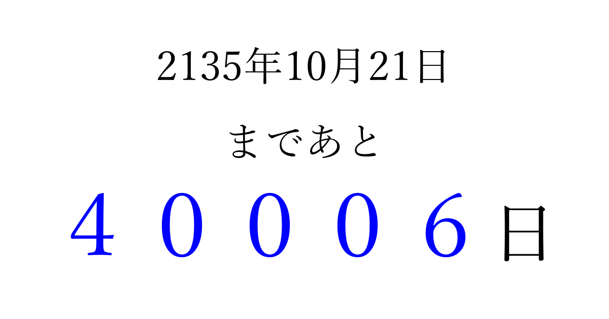 2135年10月21日(金)まで あと 99999 日です 追加すると、トップページからすぐ選べるようになります ※2026/04/09現在の結果です。 最新の状態に更新する ↓シェアして、タイムライン上にカウントダウンを表示しよう!↓ 📤 この結果を共有する Tweet シェア Threads Bluesky 別の日付でカウントダウン 2135年10月のカレンダー このページをブックマークに追加すると、いつでもカウントダウンを確認できます。 (PC: Ctrl+D / Mac: ⌘+D) hitome-notes.comでは以下のページも運営しています。 指定日と期間から日付を計算 | ガチャ確率計算・シミュレーション | プライバシー・ポリシー 運営者:Avocado