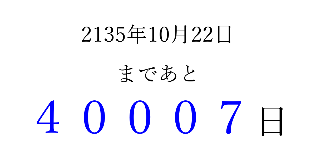 2135年10月22日(土)まで あと 99999 日です 追加すると、トップページからすぐ選べるようになります ※2026/04/09現在の結果です。 最新の状態に更新する ↓シェアして、タイムライン上にカウントダウンを表示しよう!↓ 📤 この結果を共有する Tweet シェア Threads Bluesky 別の日付でカウントダウン 2135年10月のカレンダー このページをブックマークに追加すると、いつでもカウントダウンを確認できます。 (PC: Ctrl+D / Mac: ⌘+D) hitome-notes.comでは以下のページも運営しています。 指定日と期間から日付を計算 | ガチャ確率計算・シミュレーション | プライバシー・ポリシー 運営者:Avocado
