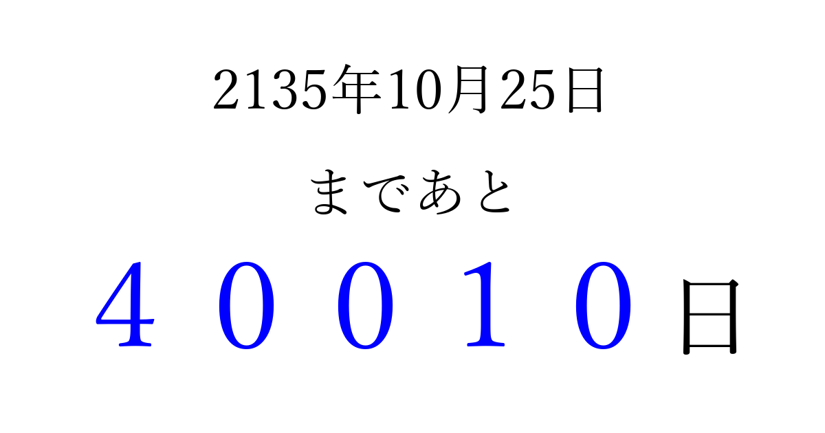 2135年10月25日(火)まで あと 99999 日です 追加すると、トップページからすぐ選べるようになります ※2026/04/09現在の結果です。 最新の状態に更新する ↓シェアして、タイムライン上にカウントダウンを表示しよう!↓ 📤 この結果を共有する Tweet シェア Threads Bluesky 別の日付でカウントダウン 2135年10月のカレンダー このページをブックマークに追加すると、いつでもカウントダウンを確認できます。 (PC: Ctrl+D / Mac: ⌘+D) hitome-notes.comでは以下のページも運営しています。 指定日と期間から日付を計算 | ガチャ確率計算・シミュレーション | プライバシー・ポリシー 運営者:Avocado