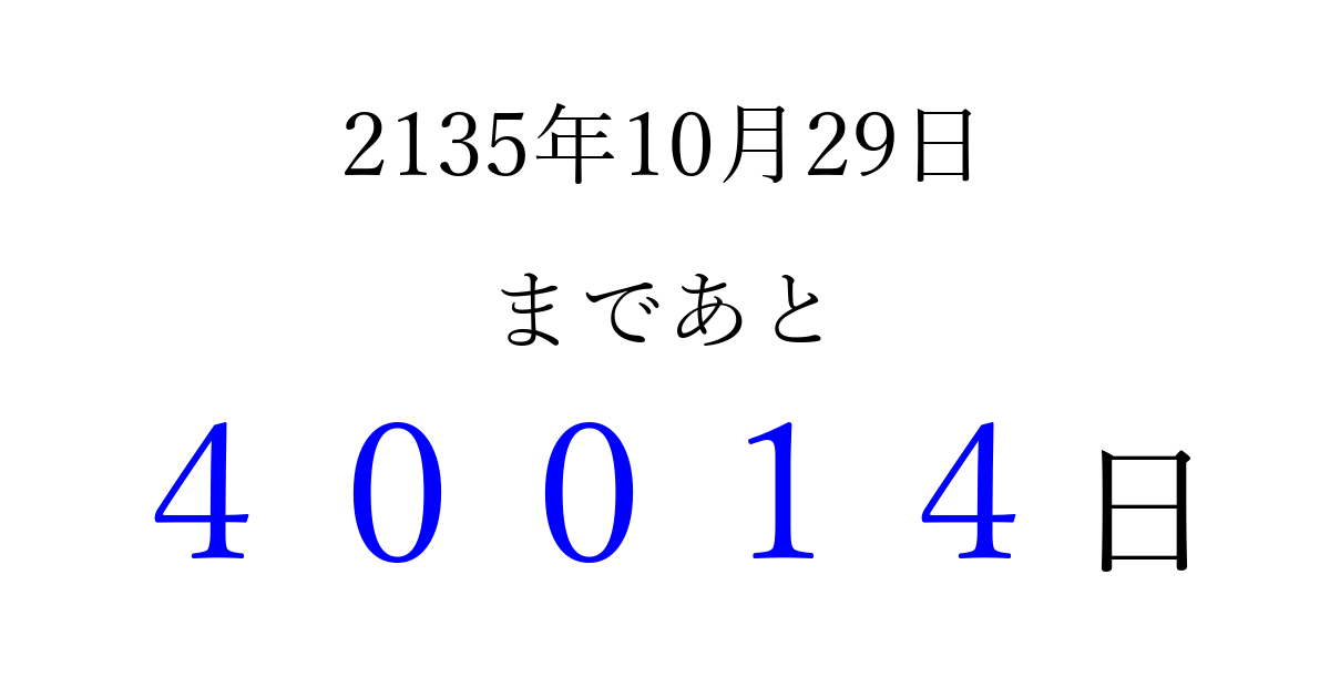 2135年10月29日(土)まで あと 99999 日です 追加すると、トップページからすぐ選べるようになります ※2026/04/09現在の結果です。 最新の状態に更新する ↓シェアして、タイムライン上にカウントダウンを表示しよう!↓ 📤 この結果を共有する Tweet シェア Threads Bluesky 別の日付でカウントダウン 2135年10月のカレンダー このページをブックマークに追加すると、いつでもカウントダウンを確認できます。 (PC: Ctrl+D / Mac: ⌘+D) hitome-notes.comでは以下のページも運営しています。 指定日と期間から日付を計算 | ガチャ確率計算・シミュレーション | プライバシー・ポリシー 運営者:Avocado