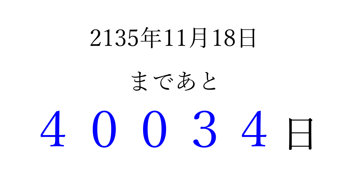 2135年11月18日(金)まで あと 99999 日です 追加すると、トップページからすぐ選べるようになります ※2026/04/09現在の結果です。 最新の状態に更新する ↓シェアして、タイムライン上にカウントダウンを表示しよう!↓ 📤 この結果を共有する Tweet シェア Threads Bluesky 別の日付でカウントダウン 2135年11月のカレンダー このページをブックマークに追加すると、いつでもカウントダウンを確認できます。 (PC: Ctrl+D / Mac: ⌘+D) hitome-notes.comでは以下のページも運営しています。 指定日と期間から日付を計算 | ガチャ確率計算・シミュレーション | プライバシー・ポリシー 運営者:Avocado
