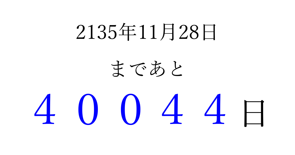 2135年11月28日(月)まで あと 99999 日です 追加すると、トップページからすぐ選べるようになります ※2026/04/09現在の結果です。 最新の状態に更新する ↓シェアして、タイムライン上にカウントダウンを表示しよう!↓ 📤 この結果を共有する Tweet シェア Threads Bluesky 別の日付でカウントダウン 2135年11月のカレンダー このページをブックマークに追加すると、いつでもカウントダウンを確認できます。 (PC: Ctrl+D / Mac: ⌘+D) hitome-notes.comでは以下のページも運営しています。 指定日と期間から日付を計算 | ガチャ確率計算・シミュレーション | プライバシー・ポリシー 運営者:Avocado