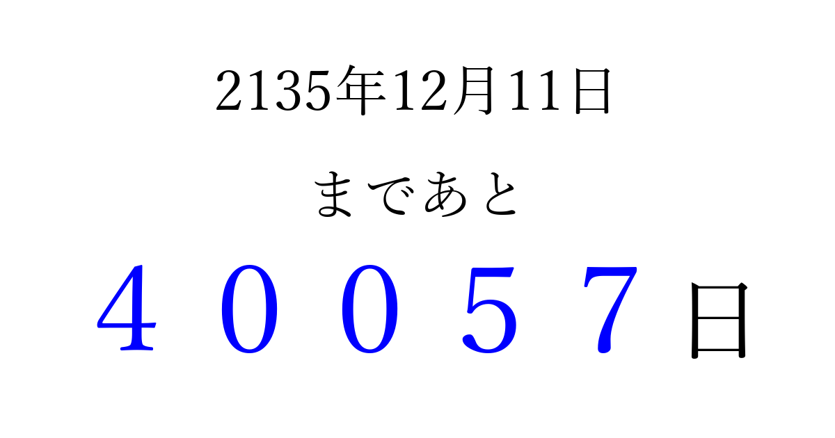 2135年12月11日(日)まで あと 99999 日です 追加すると、トップページからすぐ選べるようになります ※2026/04/09現在の結果です。 最新の状態に更新する ↓シェアして、タイムライン上にカウントダウンを表示しよう!↓ 📤 この結果を共有する Tweet シェア Threads Bluesky 別の日付でカウントダウン 2135年12月のカレンダー このページをブックマークに追加すると、いつでもカウントダウンを確認できます。 (PC: Ctrl+D / Mac: ⌘+D) hitome-notes.comでは以下のページも運営しています。 指定日と期間から日付を計算 | ガチャ確率計算・シミュレーション | プライバシー・ポリシー 運営者:Avocado