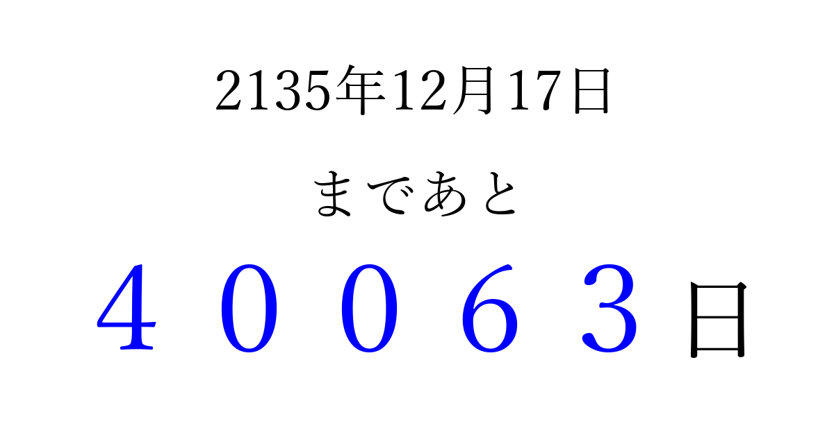 2135年12月17日(土)まで あと 99999 日です 追加すると、トップページからすぐ選べるようになります ※2026/04/09現在の結果です。 最新の状態に更新する ↓シェアして、タイムライン上にカウントダウンを表示しよう!↓ 📤 この結果を共有する Tweet シェア Threads Bluesky 別の日付でカウントダウン 2135年12月のカレンダー このページをブックマークに追加すると、いつでもカウントダウンを確認できます。 (PC: Ctrl+D / Mac: ⌘+D) hitome-notes.comでは以下のページも運営しています。 指定日と期間から日付を計算 | ガチャ確率計算・シミュレーション | プライバシー・ポリシー 運営者:Avocado