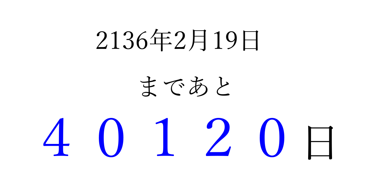 2136年2月19日(日)まで あと 99999 日です 追加すると、トップページからすぐ選べるようになります ※2026/04/16現在の結果です。 最新の状態に更新する ↓シェアして、タイムライン上にカウントダウンを表示しよう!↓ 📤 この結果を共有する Tweet シェア Threads Bluesky 別の日付でカウントダウン 2136年2月のカレンダー このページをブックマークに追加すると、いつでもカウントダウンを確認できます。 (PC: Ctrl+D / Mac: ⌘+D) hitome-notes.comでは以下のページも運営しています。 指定日と期間から日付を計算 | ガチャ確率計算・シミュレーション | プライバシー・ポリシー 運営者:Avocado