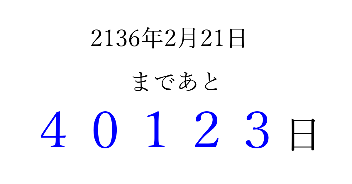 2136年2月21日(火)まで あと 99999 日です 追加すると、トップページからすぐ選べるようになります ※2026/04/15現在の結果です。 最新の状態に更新する ↓シェアして、タイムライン上にカウントダウンを表示しよう!↓ 📤 この結果を共有する Tweet シェア Threads Bluesky 別の日付でカウントダウン 2136年2月のカレンダー このページをブックマークに追加すると、いつでもカウントダウンを確認できます。 (PC: Ctrl+D / Mac: ⌘+D) hitome-notes.comでは以下のページも運営しています。 指定日と期間から日付を計算 | ガチャ確率計算・シミュレーション | プライバシー・ポリシー 運営者:Avocado