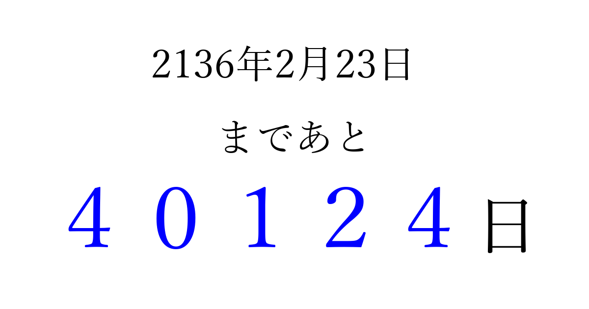 2136年2月23日(木)まで あと 99999 日です 追加すると、トップページからすぐ選べるようになります ※2026/04/16現在の結果です。 最新の状態に更新する ↓シェアして、タイムライン上にカウントダウンを表示しよう!↓ 📤 この結果を共有する Tweet シェア Threads Bluesky 別の日付でカウントダウン 2136年2月のカレンダー このページをブックマークに追加すると、いつでもカウントダウンを確認できます。 (PC: Ctrl+D / Mac: ⌘+D) hitome-notes.comでは以下のページも運営しています。 指定日と期間から日付を計算 | ガチャ確率計算・シミュレーション | プライバシー・ポリシー 運営者:Avocado