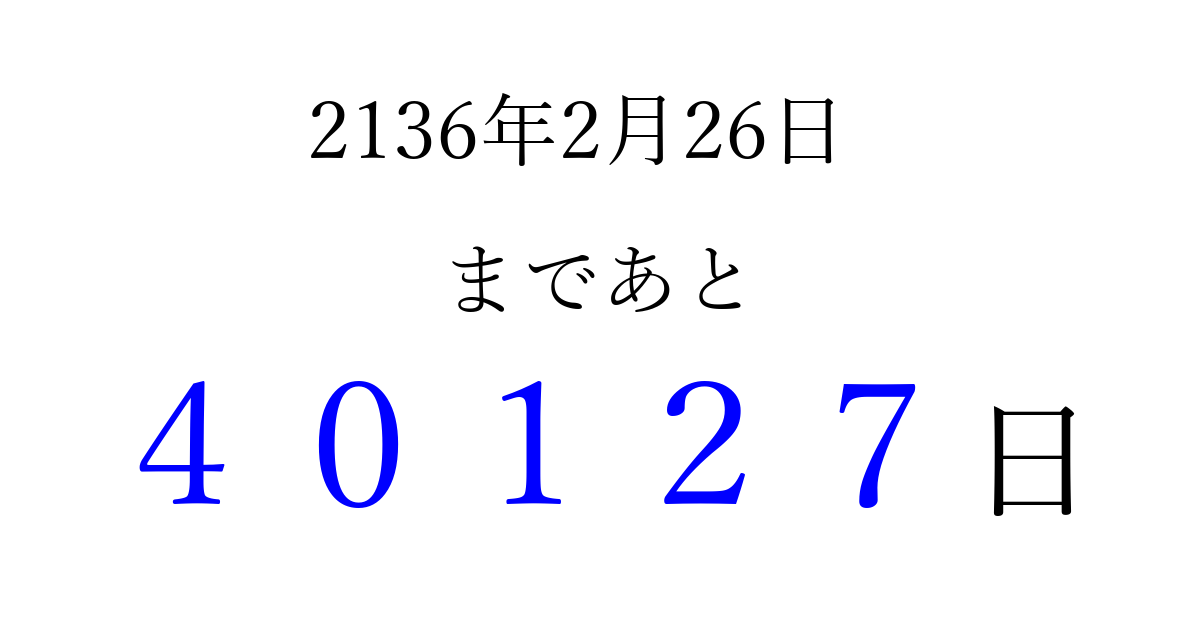 2136年2月26日(日)まで あと 99999 日です 追加すると、トップページからすぐ選べるようになります ※2026/04/16現在の結果です。 最新の状態に更新する ↓シェアして、タイムライン上にカウントダウンを表示しよう!↓ 📤 この結果を共有する Tweet シェア Threads Bluesky 別の日付でカウントダウン 2136年2月のカレンダー このページをブックマークに追加すると、いつでもカウントダウンを確認できます。 (PC: Ctrl+D / Mac: ⌘+D) hitome-notes.comでは以下のページも運営しています。 指定日と期間から日付を計算 | ガチャ確率計算・シミュレーション | プライバシー・ポリシー 運営者:Avocado